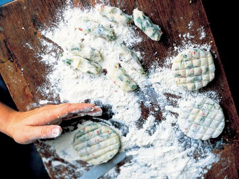 Flour your work surface, then take 1 tablespoon of the mix in your hands with a little flour and pat it into a flattened circle, rolling it in the flour. Rough and ready is good, so don’t worry about having them all exactly the same!