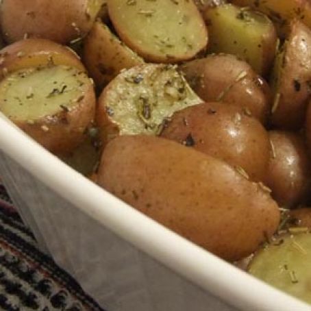 Cut the potatoes in half and set aside. In a large bowl, mix together the remaining ingredients until well combined. Add the potatoes and toss well to coat evenly. Pour everything into a baking dish and bake for 30 to 45 minutes, stirring occasionally to ensure even cooking and browning. When done, the potatoes should be quite tender, almost falling apart. Serve hot.