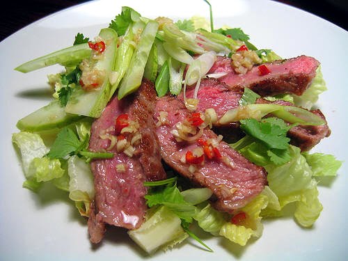 Barbeque the beef, and thinly slice it into bite sized pieces. Combine with the salad ingredients, and mix the sauce and toss the whole.