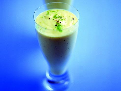 Peel the banana and roughly chop it. Skin the mangoes, remove the stones and roughly chop the flesh. Put the fruit in a food processor or liquidizer and blend together with the rest of the ingredients. Make sure you blend the mixture really well, then pour the fruit smoothie into a tall, chilled glass. Sprinkle over a bit of lime zest and some freshly ground black pepper. Drink straight away.