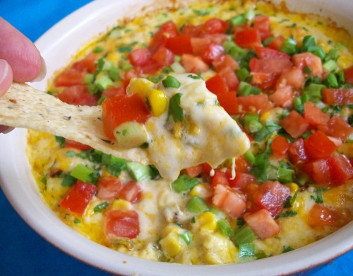 Top with diced tomatoes, green onions, and cilantro. Serve immediately with tortilla chips.