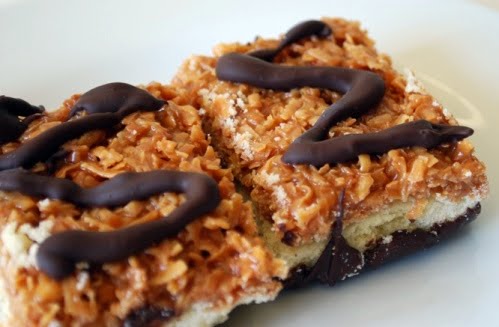 When cooled, cut into 30 bars with a large knife or a pizza cutter (it’s easy to get it through the topping).