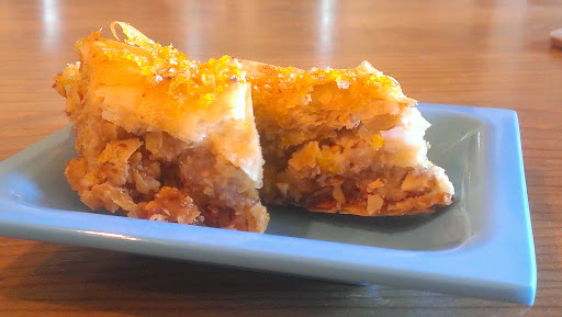 When baklava is golden and fairly crisp, remove from oven and add syrup, drizzling over top, then bake about 5 more min, should be crisp and syrup saturated.