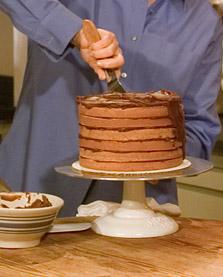 4. If cakes are not level, use a serrated knife to trim tops off. Carefully slice each cake horizontally into three equal layers, about 3/4 inch thick. (You will have six layers.) To assemble, place one sliced layer on an 8-inch cardboard cake round. Spread with 1/2 cup frosting. Repeat with remaining layers, placing the final layer bottom side up. Cover cake with remaining frosting. Serve immediately.