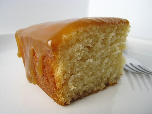 A moist buttermilk cake with a healthy crumb topped with a creamy caramel glaze. The cake is just the right amount of sweet.
