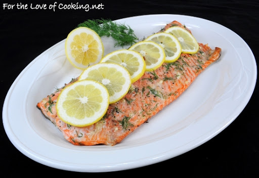 Combine the butter, olive oil, and garlic together then spread evenly over the top of the fish. Season with sea salt and freshly cracked pepper, to taste. Sprinkle freshly chopped dill all over followed by a layer of lemon slices. Place skin side down on the prepared baking sheet.