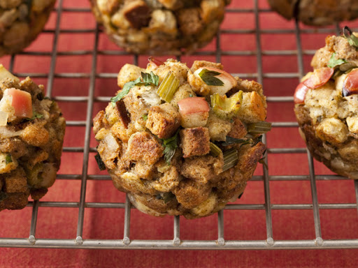 Butter 12 muffin cups, 2 tins, liberally with remaining butter. Use an ice cream scoop to fill and mound up the stuffing in muffin tins. Remove the bay leaf as you scoop the stuffing when you come upon it. Bake until set and crisp on top, 10 to 15 minutes. Remove stuffin' muffins to a platter and serve hot or room temperature.