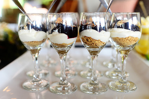 Crush the graham crackers (add melted butter, optional) and spoon into the bottom of mini wine glasses (found at Bed Bath & Beyond).