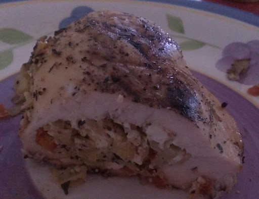 Place each chicken breast between two sheets of plastic wrap and, with a meat mallet or the back of small pan, pound to flatten to an even thickness of about ¼-inch. Place the breasts, skin side down, and spread each one with a quarter of the stuffing. Fold the breasts in half over the stuffing and use toothpicks to skewer the sides closed. Brush both sides with oil and season with salt and pepper.
