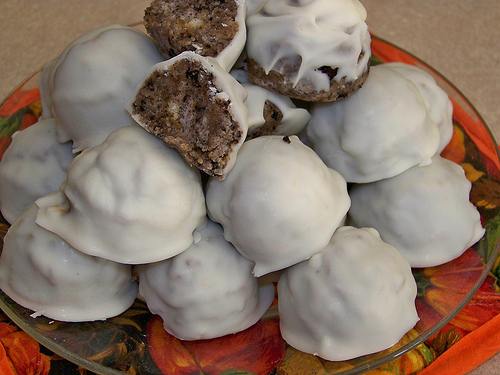 Crush cookies in food processor and mix with cream cheese. Roll into ping-pong sized balls. Melt almond bark. Dip balls into melted bark and place on waxed paper to dry.