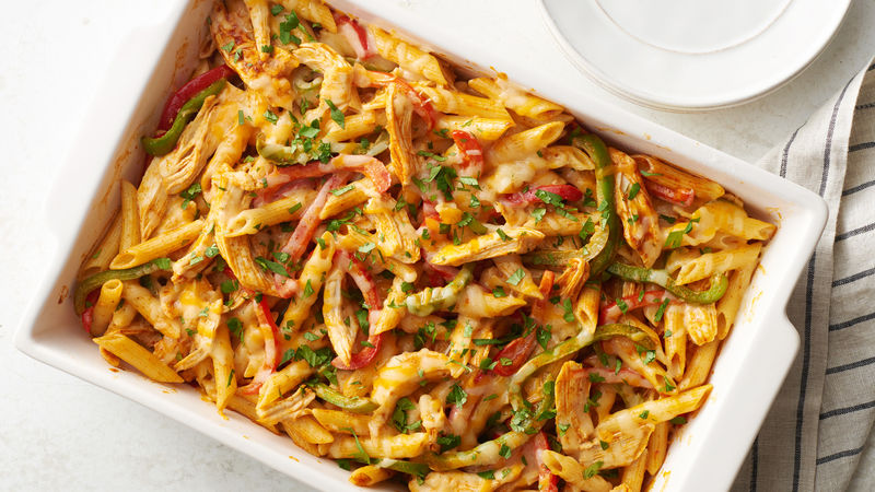 4. In large bowl, toss together cooked pasta, bell peppers and onion, 1 lb shredded cooked chicken breast, 1 package fajita seasoning mix and 1 cup cream until combined. Pour into baking dish.
