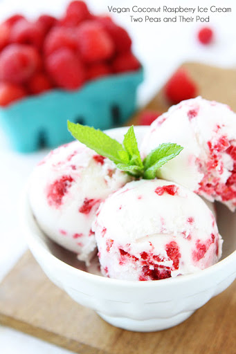 2. Freeze using an ice cream maker, according to manufacture's instructions. During the last few minutes of churning, add in the raspberries. You can serve immediately for a soft serve texture or you can place the ice cream in a container and freeze for a firmer texture.