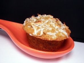 In a large mixing bowl, cream together butter, sugar, vanilla and rum extract until thoroughly combined. Add eggs, one at a time, beating until combined. Mix in honey and mashed bananas until well combined. Add the dry ingredients and stir just until combined - fold in the dried pineapple. Evenly divide the batter between the wells of a 12 cup muffin tin lightly coated with nonstick spray. Sprinkle the batter with coconut.