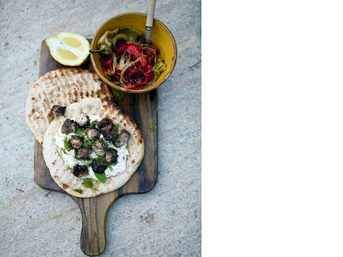 Put a dollop of tzatziki and the meat from one skewer on each warmed flatbread. Top with some of your pepper mixture, a drizzle of extra virgin olive oil and a good squeeze of lemon juice. Life doesn’t get much better.