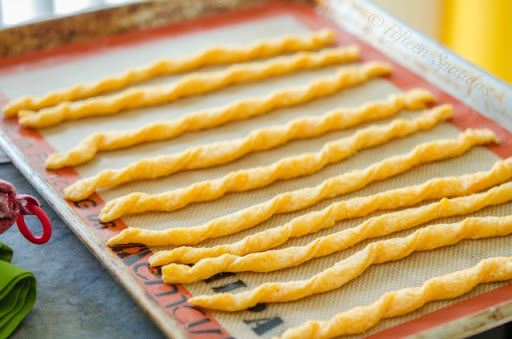 Roll out onto a floured surface to about 1/8 inch thick. Cut into long strips with a pizza cutter and twist them onto the baking sheet. Bake for 10 minutes until crisp and a light golden brown. Let cool slightly, then enjoy!