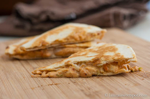 Heat a skillet over medium heat. Grease pan with either spray oil or butter. Fill half a tortilla with about ⅓ cup chicken mixture. Fold tortilla over and place in skillet. Toast each side until golden brown, about 2 minutes per side. Serve warm!