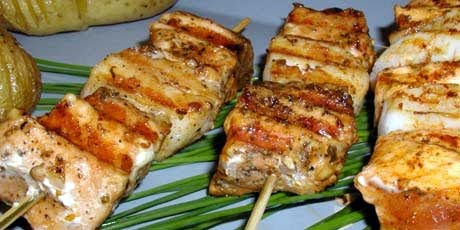 3. Place kabobs on greased grill over medium heat; close lid and grill, turning once, until scallops are opaque and fish flakes easily when tested with fork, about 6 minutes.