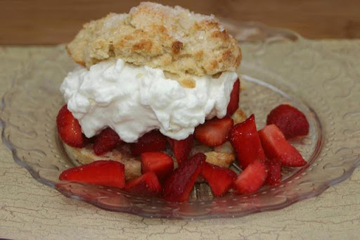 Using a large spoon, drop mixture into 4 equal piles on an ungreased baking sheet. Bake 12 to 15 minutes at 425 degrees. Remove biscuits to a cooling rack and let cool for a few minutes. To serve, split a warm biscuit in two, spoon 1/4 of the berry mixture over the bottom half top with whip cream and the other half of the biscuit.