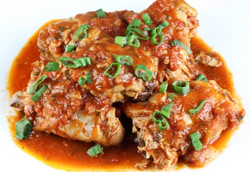 Alternately, instead of cooking the chicken on the stovetop, you could place the pot with the chicken and sauce in an oven preheated to 350 degrees F. and cook for an hour and a half, then uncover and cook an additional 15 minutes or until the sauce has thickened.