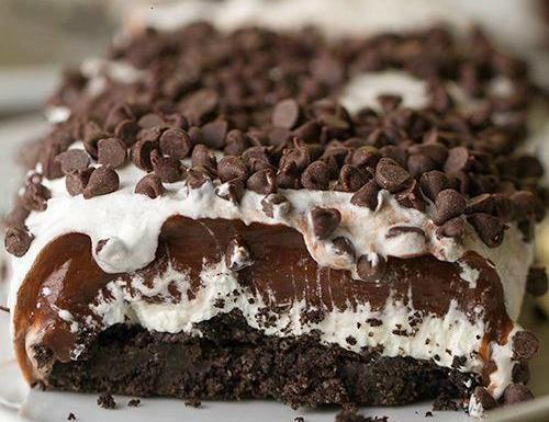 5. Spread the remaining Cool Whip over the top. Sprinkle mini chocolate chips evenly over the top. Place in the freezer for 1 hour, or the refrigerator for 4 hours before serving.