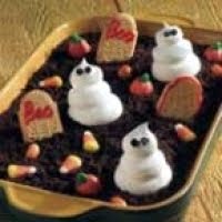 Use cool whip to make ghost-shaped blobs on the top, create swirls of *ghosts* on top, use pieces of black licorice for the eyes.