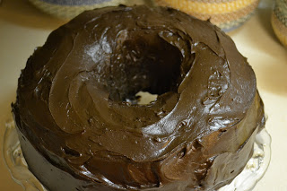 Use a spatula to spread the fudge frosting over the crown of the Bundt in a thick layer.