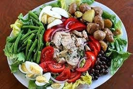 Just before serving, arrange lettuce leaves on plate, place tuna in middi and arrange potatoes, tomatoes, and green beans around tuna. Garnish with eggs and anchovies; pour remaining dressing over the tomatoes, and eggs. Serve immediately.