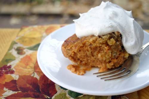 Stir first 5 ingredients. Pour into greased 9 x 13 pan. Sprinkle cake mix over pumpkin. Sprinkle with pecans. Drizzle butter over top. Bake 1 hour 5 minutes at 350 degrees until golden brown. Let stand 10 minutes. Serve with cool whip.