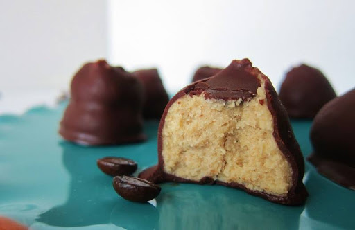 For the filling, in a food processor, combine the cashews, water, coconut nectar, sea salt, vanilla, and coffee extract and process until smooth. With the processor running, add the coconut oil and process another minute until well incorporated. Pour into a bowl, and place in the freezer until firm, but scoopable. Scoop some of the cream out of the bowl by the heaping Tbspful and form into balls. Place on foil, and once they are all rolled, place back in the freezer to harden.