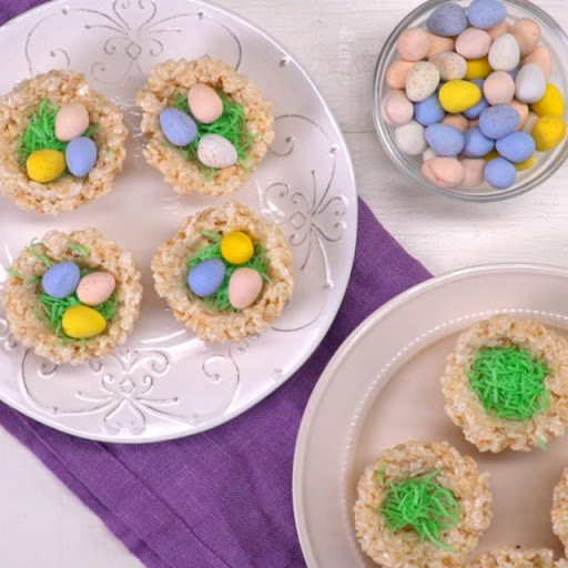 Fill the cooled nests with the coconut “grass” and chocolate eggs, Jordan almonds, or jelly beans. The nests are best if served the same day, but can be stored for no more than two days at room temperature in an airtight container.