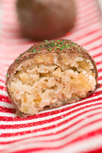 Combine first 4 ingredient. Mix well. Add nuts. Chill 20 minutes. Roll in small balls and put in refrigerator overnight. Next day, mix large package of chocolate chips and ¼ lb. paraffin. Dip and cool on waxed paper.