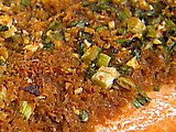 In a mixing cup, combine the soy sauce, rice vinegar, lemon juice, oyster sauce, fish sauce, sesame oil, chili paste, scallions, garlic, and ginger. Pour 1/3 of soy sauce mixture over the salmon fillet. Sprinkle the panko evenly over the fillet. Pour the rest of the soy sauce mixture evenly over the panko. Be sure to soak the panko completely and if any runs off, spoon back onto the salmon. Set aside for 15 minutes, leaving all the sauce in the pan.