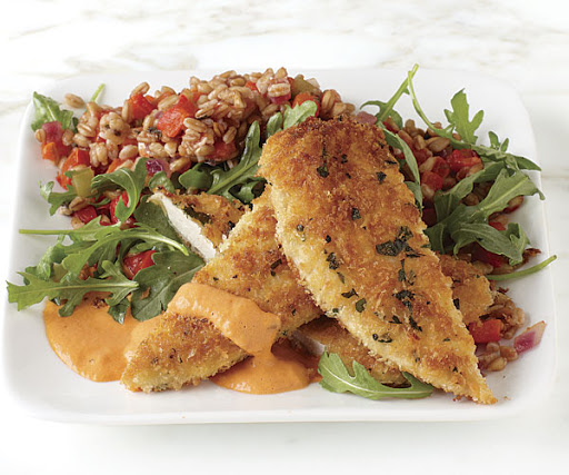 Chicken Cutlets with Cacciatore Farro Salad and Red Pepper Aïoli