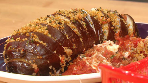 Toss the garlic-butter panko with cheese, chopped parsley and mint. Once eggplant is crispy at edges, top with breadcrumbs, return to oven to brown, 10-15 minutes more.