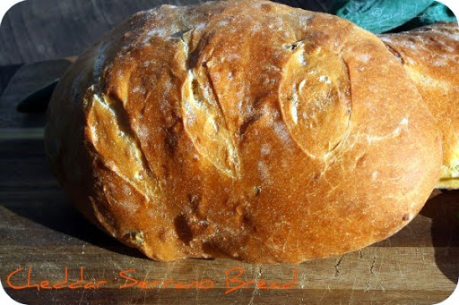 Mix in eggs and oil. Toss cheese and serranos with flours and salt. Mix all into wet ingredients with wooden spoon. Turn out onto lightly floured surface and knead until smooth and elastic, ~10-15 minutes. Place in an oiled bowl and cover w/ plastic or a slightly damp towel. Let rise until doubled in size, ~2 hours. Punch down.