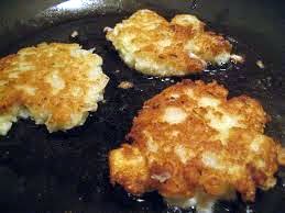 Pour oil into an electric skillet to about an 1/8 inch deep and heat to the highest setting (400 degrees). Fry 1/8 cup spoonfuls of batter until golden brown. Cool latkes on paper towels to drain some of the oil before eating. Serve with toppings of choice, such as applesauce, sour cream, or even raspberry habanero jelly.