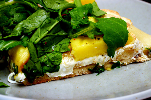 Peel the skins off the squash. Top the cooked pizza with the cooked squash. Top with arugula and the remaining 1/4 teaspoon salt and pepper. Slice and serve.