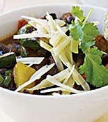 3.Divide the chili among 4 bowls. Top with the cilantro and cheese and serve with the lime wedges and tortilla chips.