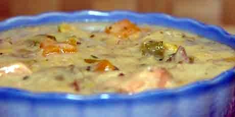 Creamy, hearty clam chowder with salmon and sweet potatoes.