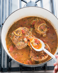 **Surprisingly, Mario Batali pairs these braised veal shanks with white wine. A Santa Barbara Chardonnay matches the richness of the dish.