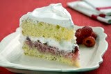 To assemble the cake: Place 1 layer on a flat serving or cake plate, top side down, and spread with crushed raspberries. Top with 3/4 cup frosting, spreading gently on top of the raspberries. Place the second cake layer on top, top side up, and frost the top and sides. Decorate with the reserved raspberries.