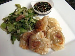 Spray a large nonstick skillet with cooking spray and set over medium high heat. Add 12 dumplings and cook until golden brown on the bottom, about 2 minutes. Flip and cook a minute or two longer. Add 1/2 cup water to the pan and cover. Reduce heat and simmer until the dumpling are cooked through, about 4 minutes. Transfer to a platter and keep warm. Repeat with the remaining dumplings. Serve with the dipping sauce.