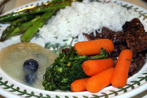Serve steak with rice, carrots & broccolini, grilled asparagus and blueberry applesauce.