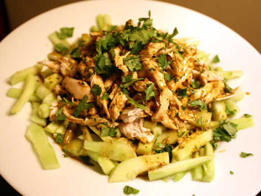 4. Scatter the cucumber pieces on a plate. Top with the shredded chicken, and pour on the sauce. Garnish with more cilantro.