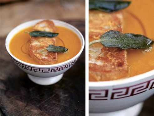 When the squash is soft and cooked through, whiz the soup with a hand blender or pour it into a liquidizer and pulse until you have a smooth purée (but you can leave it slightly chunky if you like). Most importantly, remember to taste and season it until it’s perfect. Divide the soup between your bowls, placing 2 croutons on top of each. Sprinkle with a few of your crispy sage leaves and drizzle with a swirl of good-quality extra virgin olive oil.