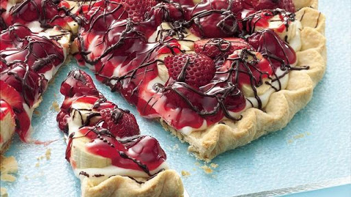 Spread 1/4 cup of the melted chocolate chips evenly over cooled baked crust. Spread yogurt over chocolate. Arrange banana slices on top of yogurt. Spread pie filling evenly over top. Arrange strawberries over pie filling. Drizzle remaining melted chocolate over top. Cut into wedges. Store in refrigerator.