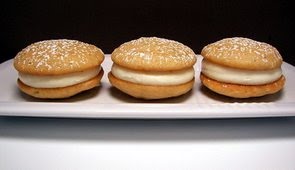 In a large mixing bowl, beat cream cheese until smooth. Add confectioners' sugar and vanilla, mixing until smooth and creamy. On the flat side of half the cakes, spoon about one tablespoon worth of the filling on top. Top with the unfilled halves to form a sandwich. Lightly dust with confectioners' sugar before serving.