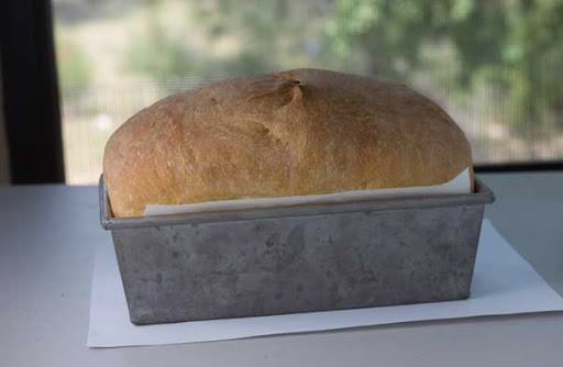 4.Rub a second bowl with butter. Put the dough in the greased bowl, cover with plastic wrap and let rise in a warm place for 1 hour. Press it down and pat it into a rectangle. Roll into a cylinder and put the cylinder in a greased and floured 8 ½ by 4 ½ inch loaf pan.
