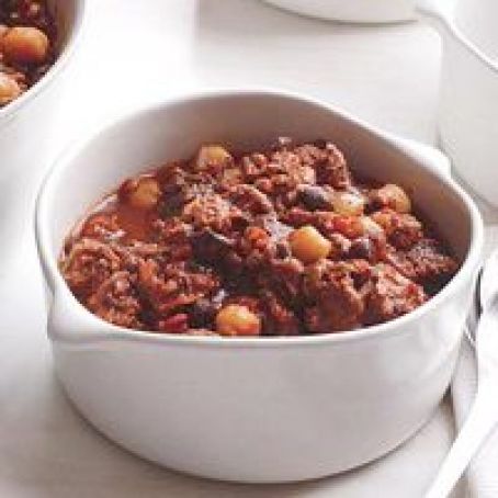 Puree the reconstituted ancho chilies and stock in a food processor. Add the chili stock mixture, beans and tomatoes to the chili. Cook for 15 minutes until thickened, then turn off the heat, cool, cover and chill for make-ahead meal.