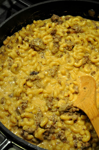 Add the pasta, milk, water and spices and stir to combine. Bring to a boil and turn the heat down to simmer. Cook for 10-12 minutes, or until the pasta is al dente. Add the cheese and stir to combine. Serve immediately